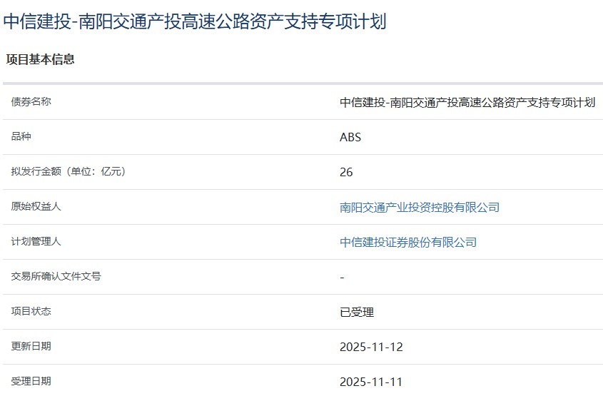 【大河财立方消息】11月12日,中信建投-南阳交通产投高速公路资产支持专项计划获上交所受理。该债券品种为ABS,拟发行金额26亿元,原始权益人为南阳交通产业投资控股有限公司,计划管理人为中信建投。